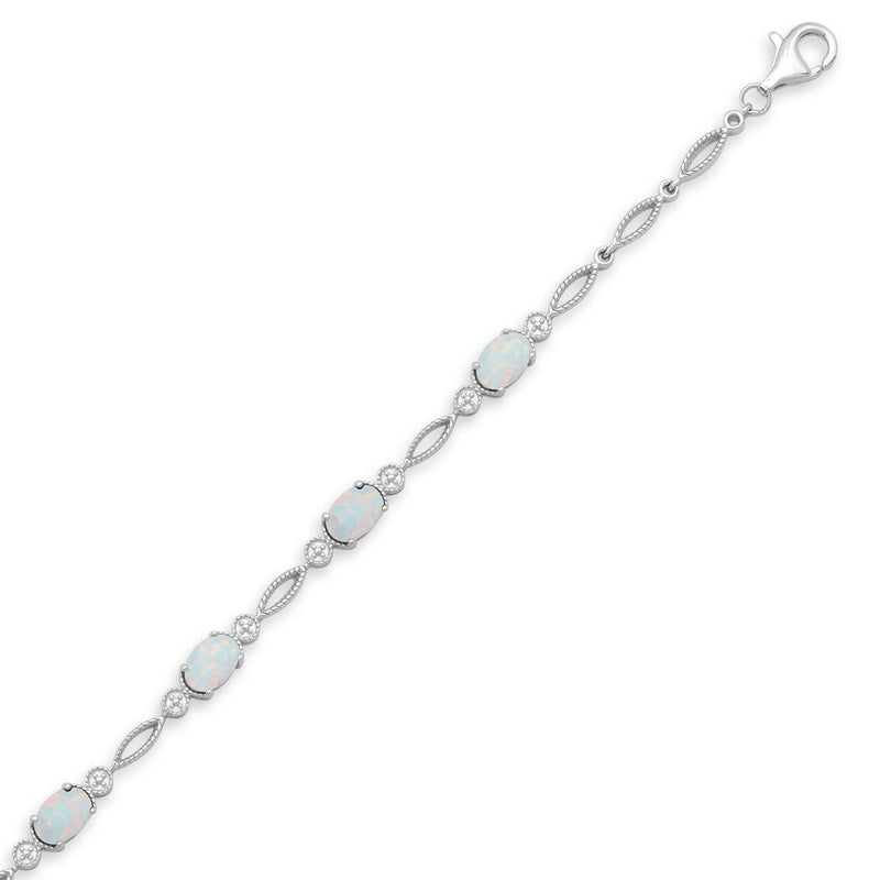 • Sterling Silver Fashion Bracelet featuring an 7x5mm Oval Shape Created Opal alternating with an Open Milgrain Link. Secured with Lobster Lock.
