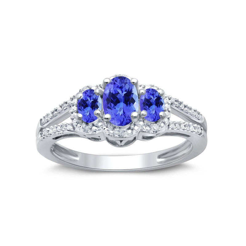 Jewelili Sterling Silver with Oval Shape Tanzanite and Natural Round Diamonds Ring