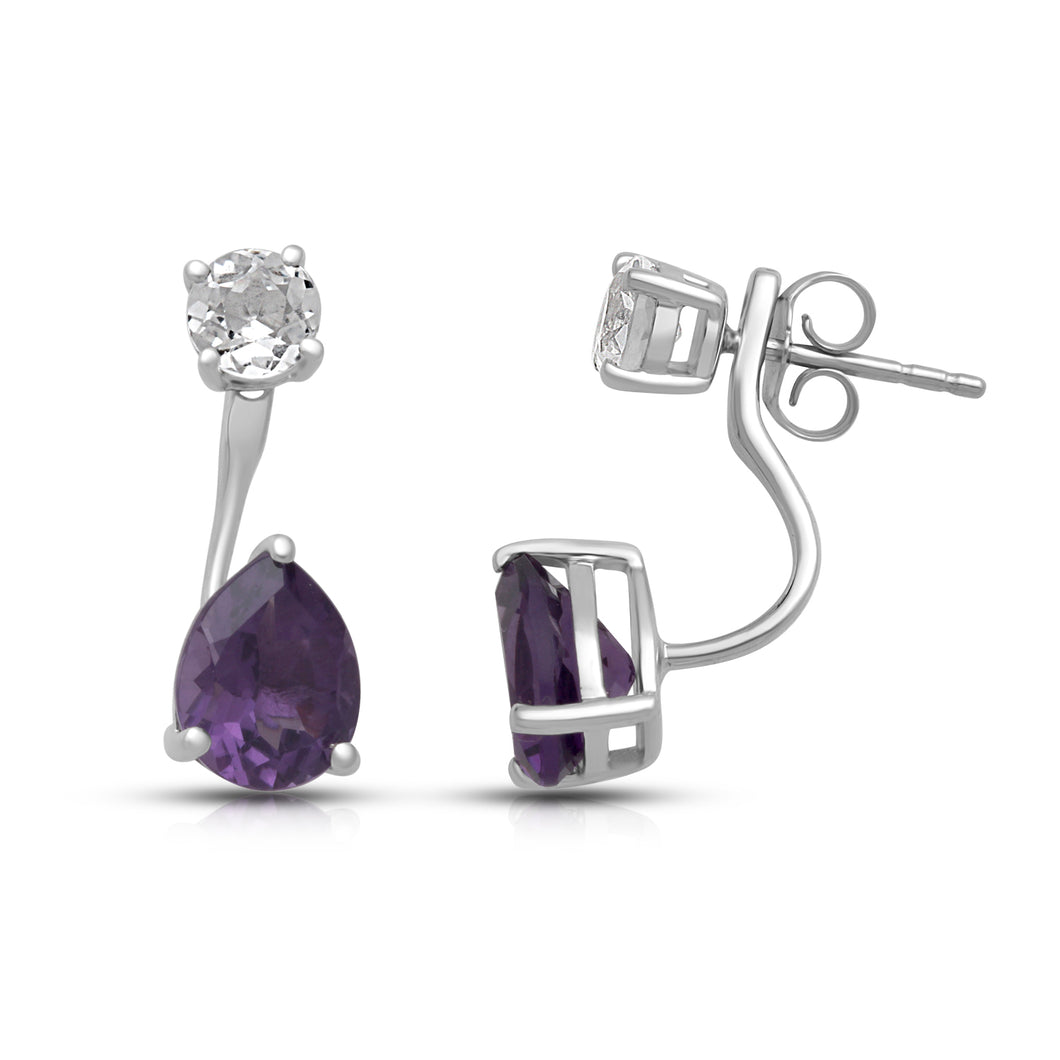 • Sterling Silver with Pear Shape Amethyst and Round Shape Created White Sapphire Jacket Teardrop Drop Earrings