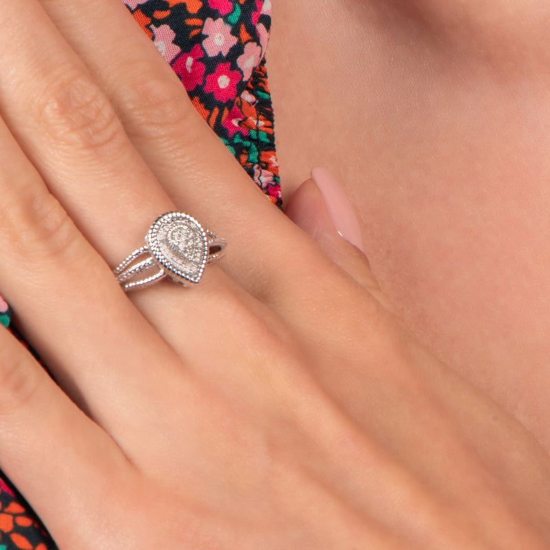 • Teardrop Sterling Silver Ring set with Round White Diamonds