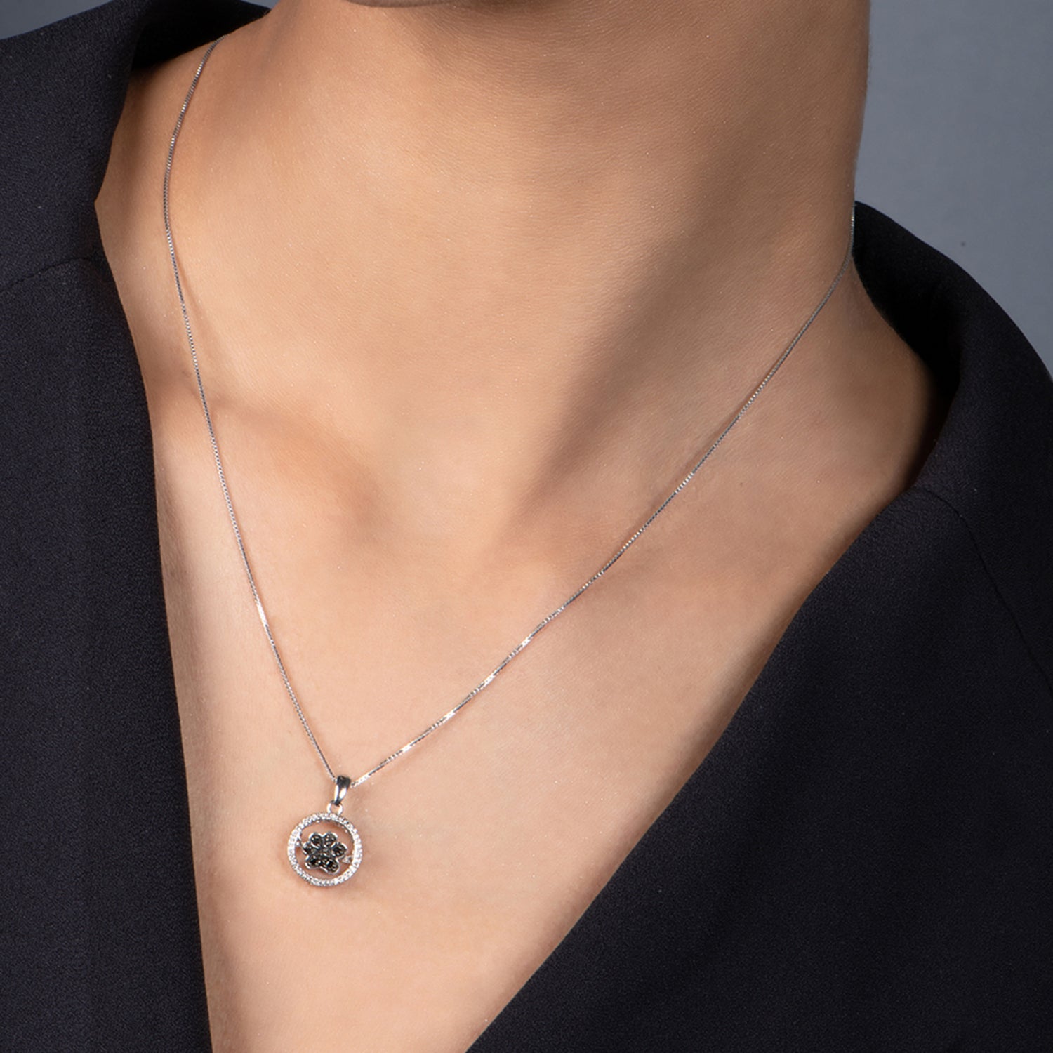 Details: Sterling Silver With Treated Black Diamonds and Natural White Diamonds Dancing Dog Paw Circle Pendant Necklace