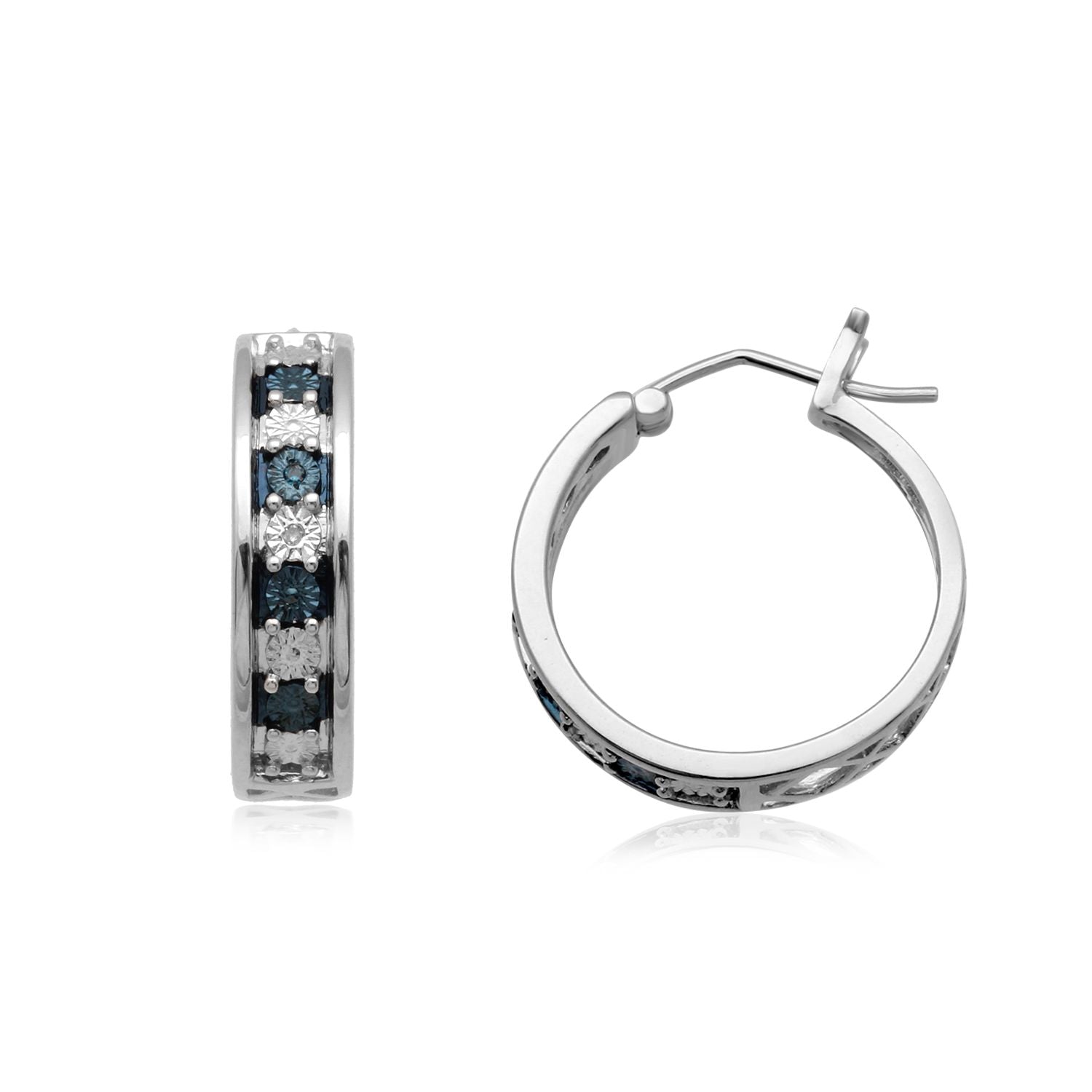 Jewelili Sterling Silver With Treated Blue and White Natural Diamond Hoop Earrings