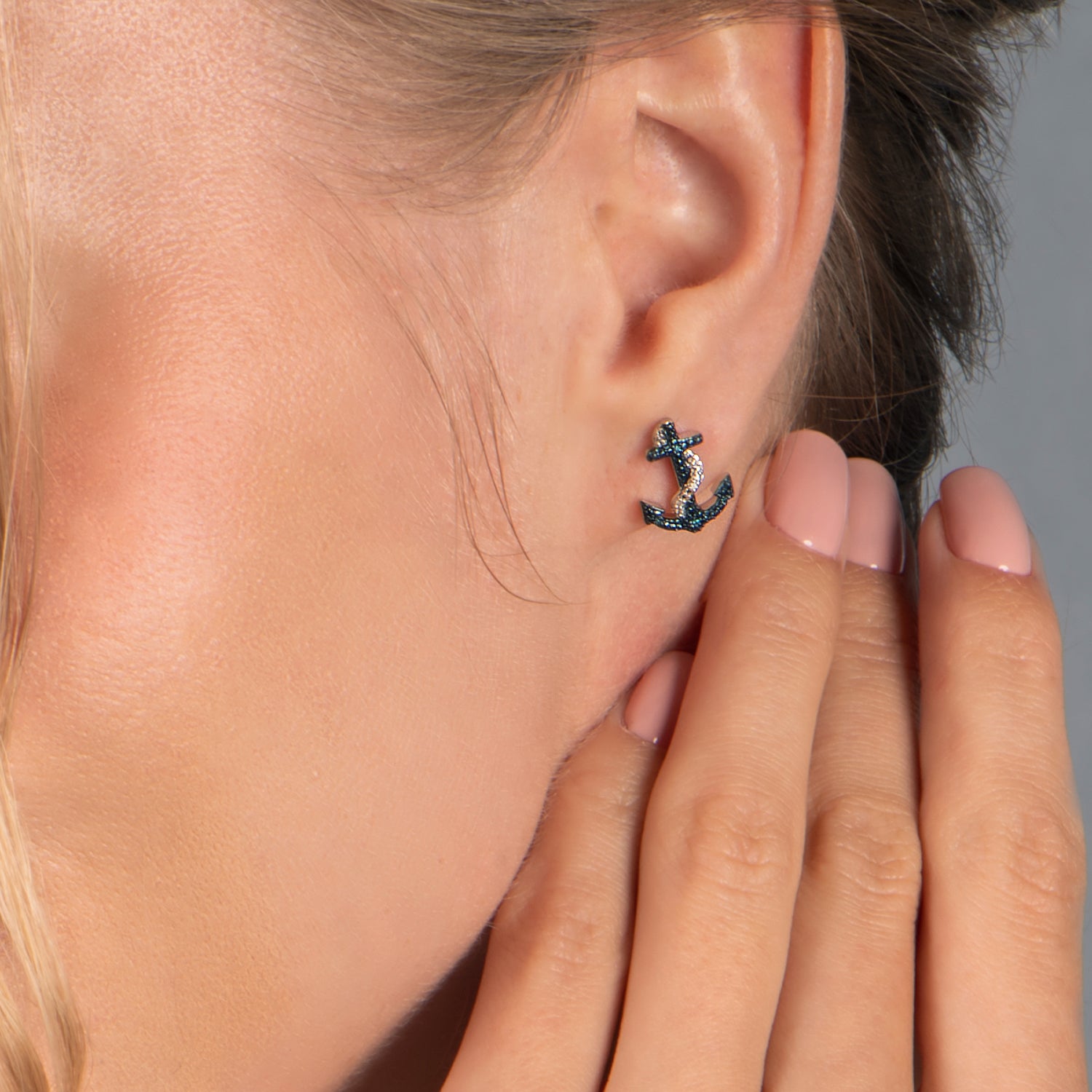 • Load image into Gallery viewer, Jewelili Anchor Stud Earrings with Treated Blue and White Natural Diamonds in Sterling Silver View 4