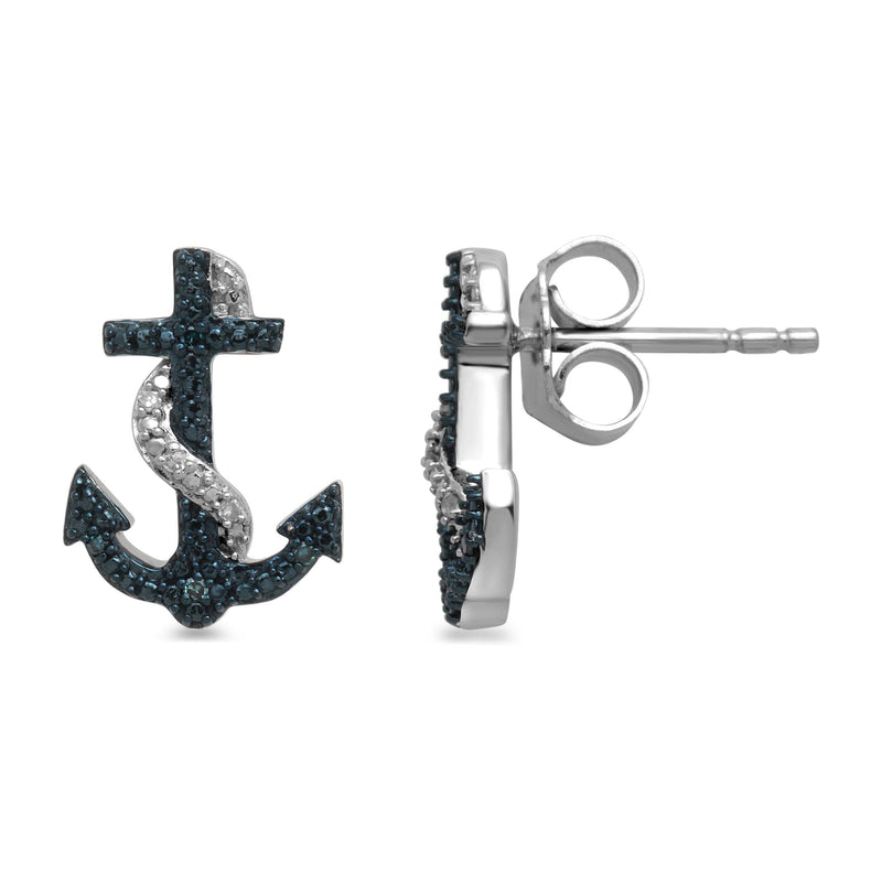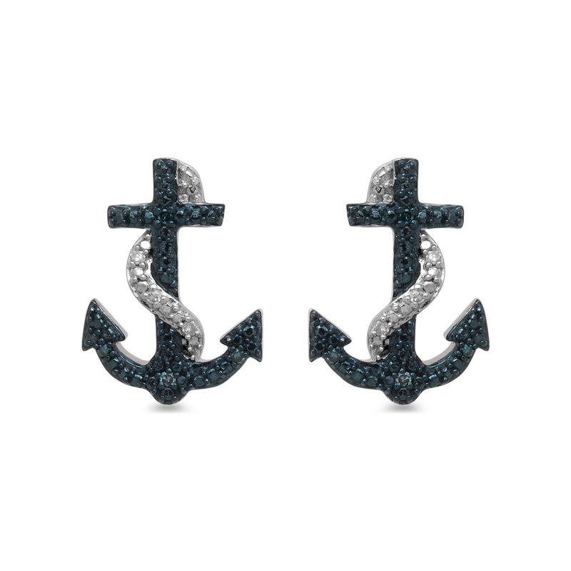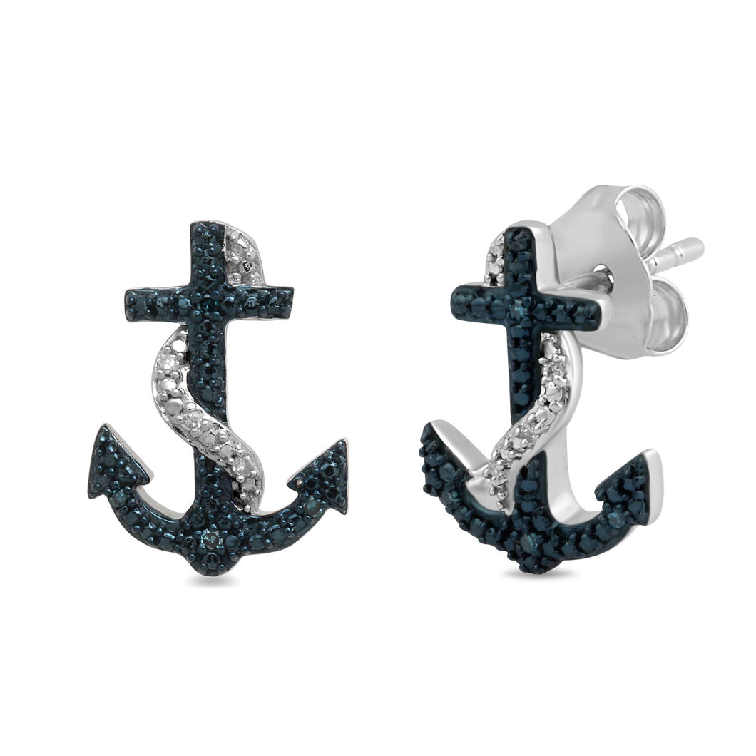 • Sterling Silver With Treated Blue and White Natural Diamonds Anchor Stud Earrings