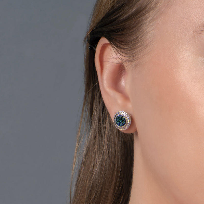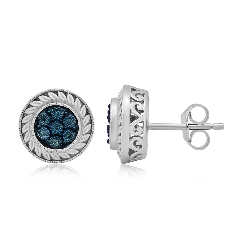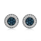 • Round stud earrings featuring clusters of small blue diamond encircled by sterling silver halos with milgrain trim