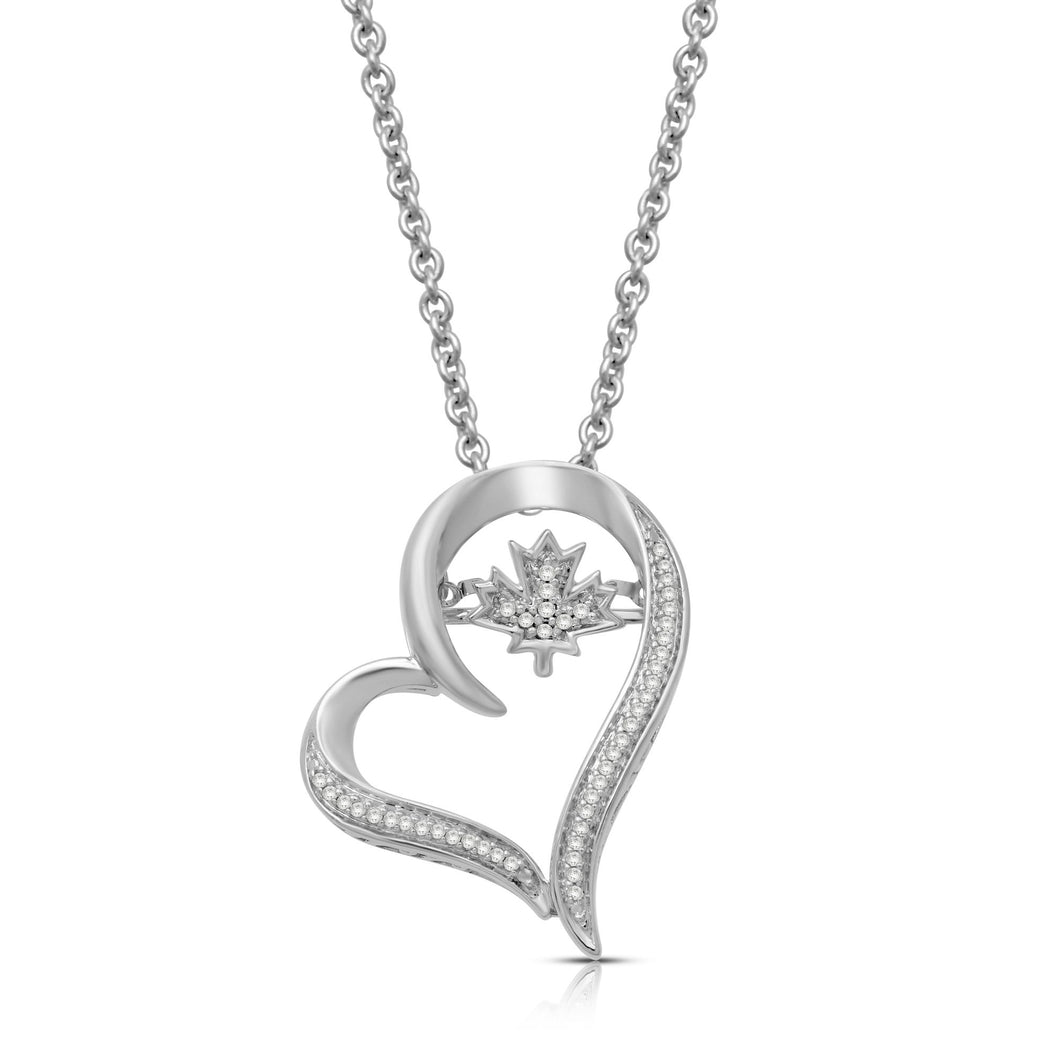 • Sterling Silver Tilted Heart Pendant Necklace Dancing Leaf within set in White Diamond