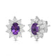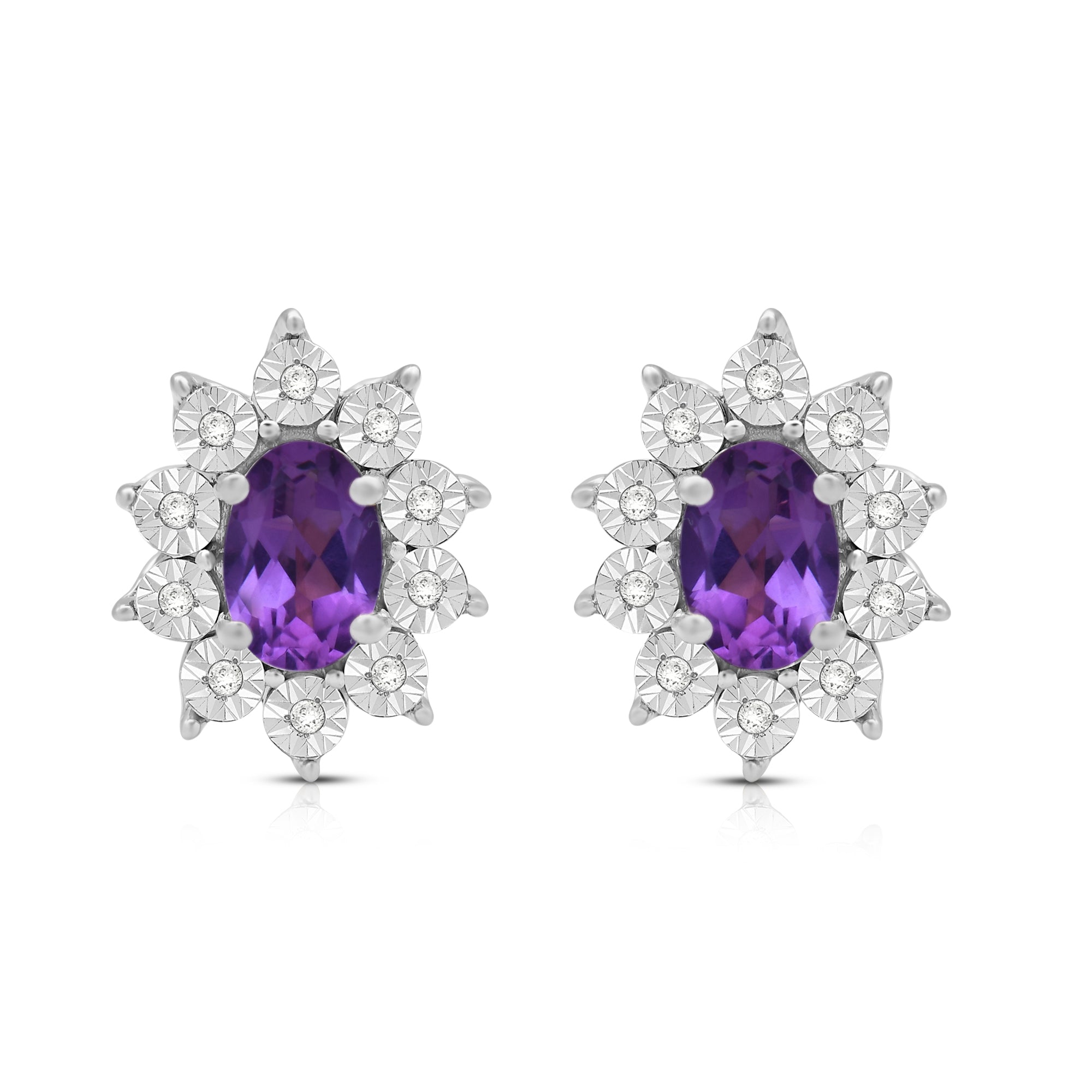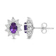 Elevate your style with our exquisite Sterling Silver cluster stud earrings. Each earring features a 6x4mm oval Created Amethyst gemstone, surrounded by a delicate cluster of 1/20 carat total weight natural white round Diamonds. Sterling silver enhances the allure of these earrings, creating a luxurious and sophisticated look. These earrings are the perfect addition to any ensemble, adding a touch of elegance and brilliance to both formal occasions and everyday wear.