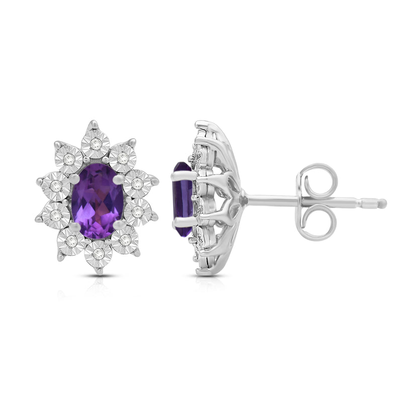Jewelili Sterling Sliver 6x4 MM Oval Created Amethyst and 1/20 Cttw Natural White Round Diamond Cluster Stud Earrings