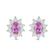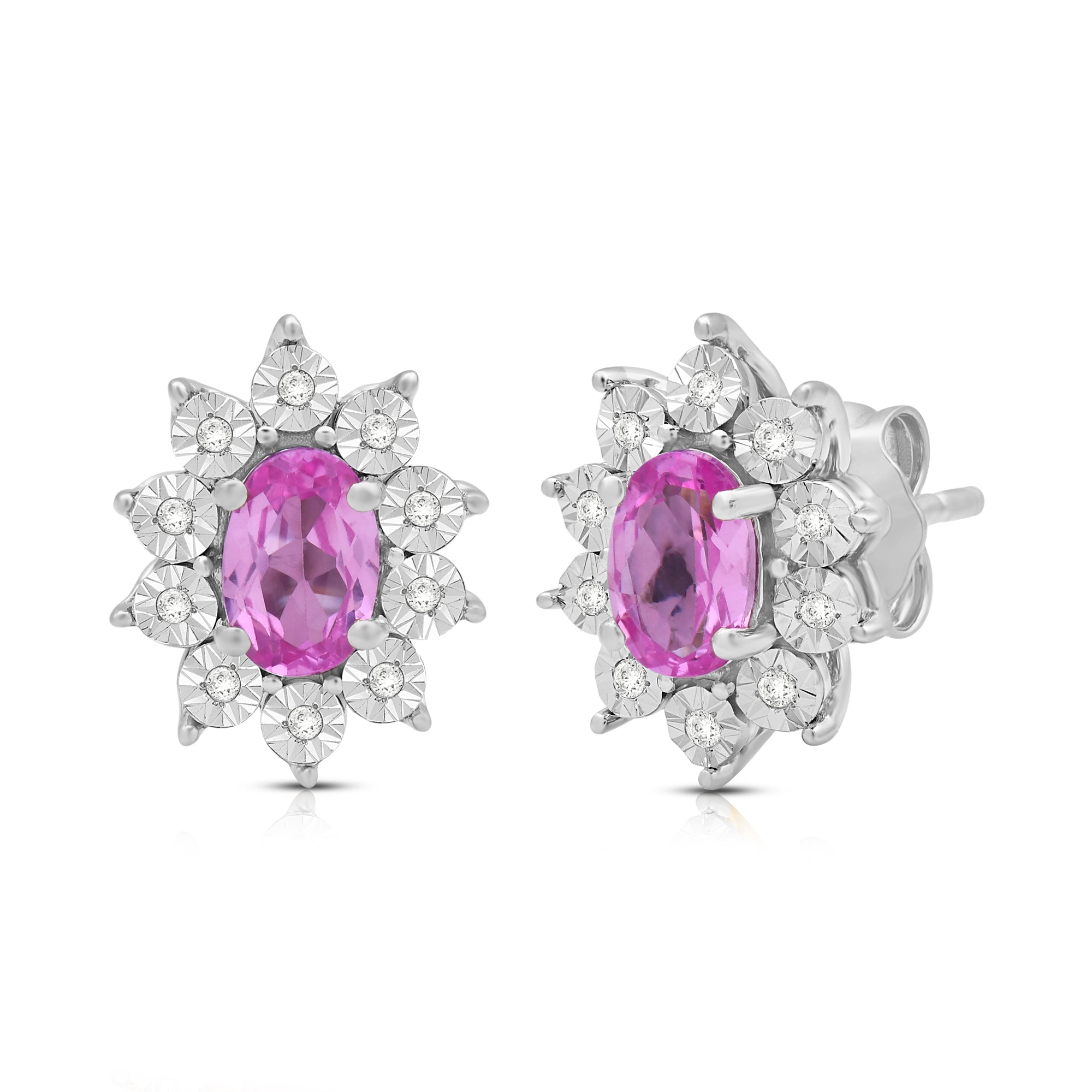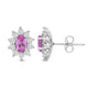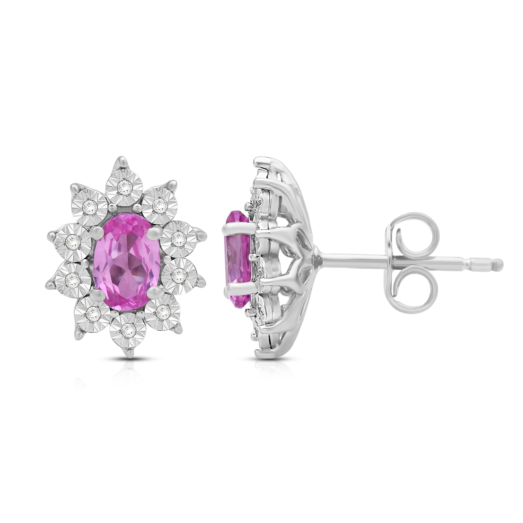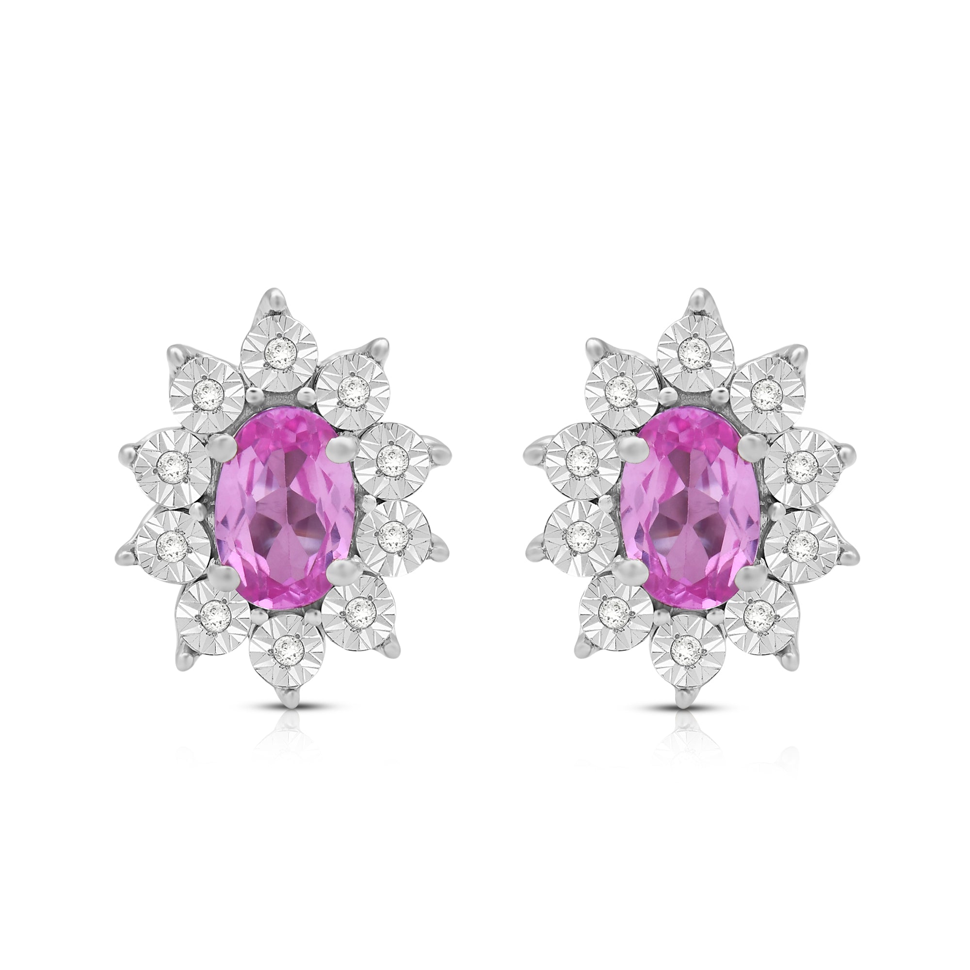 Elevate your style with our exquisite Sterling Silver cluster stud earrings. Each earring features a 6x4mm oval Created Pink Sapphire gemstone, surrounded by a delicate cluster of 1/20 carat total weight natural white round Diamonds. Sterling silver enhances the allure of these earrings, creating a luxurious and sophisticated look. These earrings are the perfect addition to any ensemble, adding a touch of elegance and brilliance to both formal occasions and everyday wear.