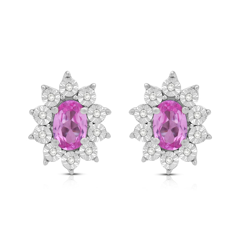 Jewelili Sterling Sliver 6x4 MM Oval Created Pink Sapphire and 1/20 Cttw Natural White Round Diamond Cluster Stud Earrings