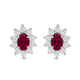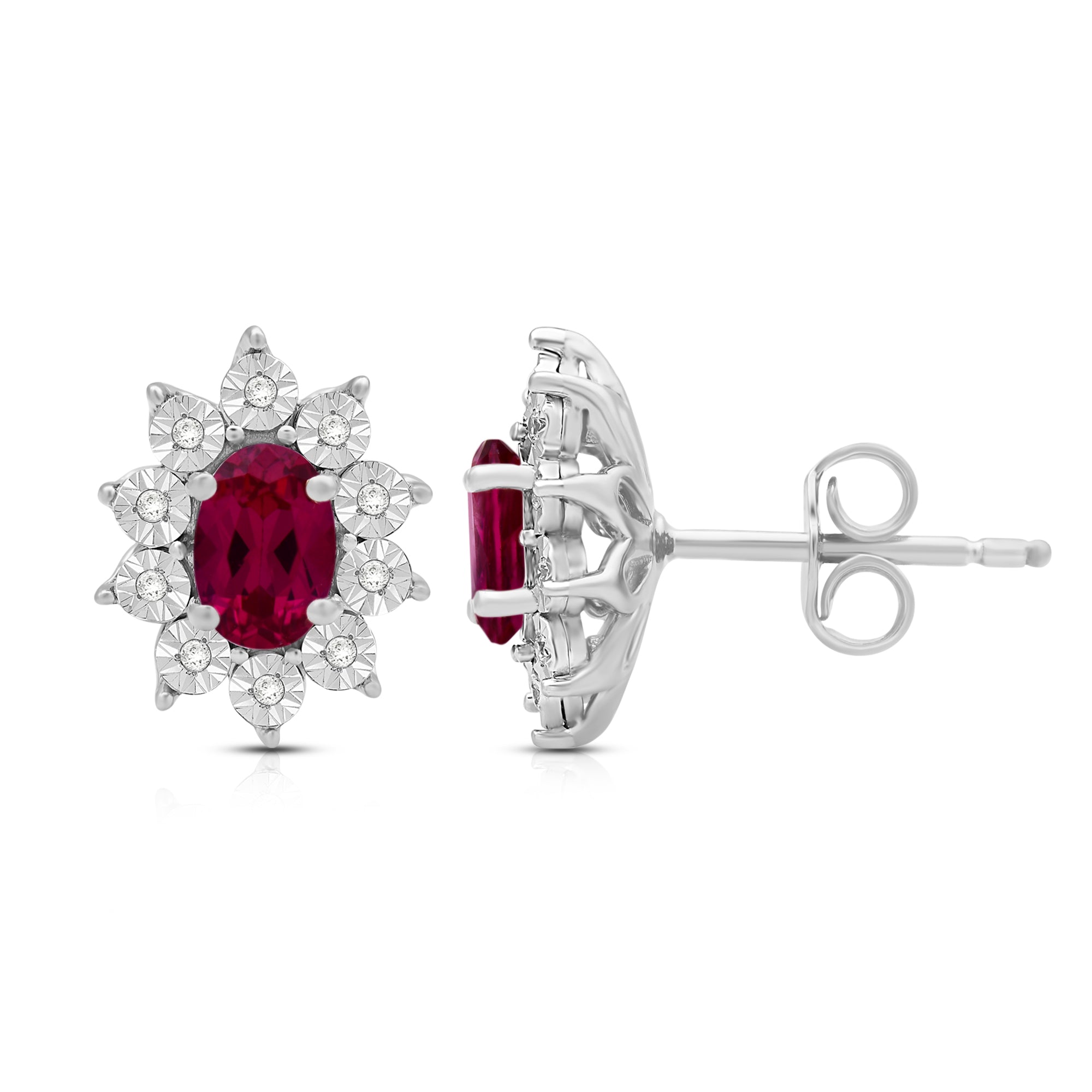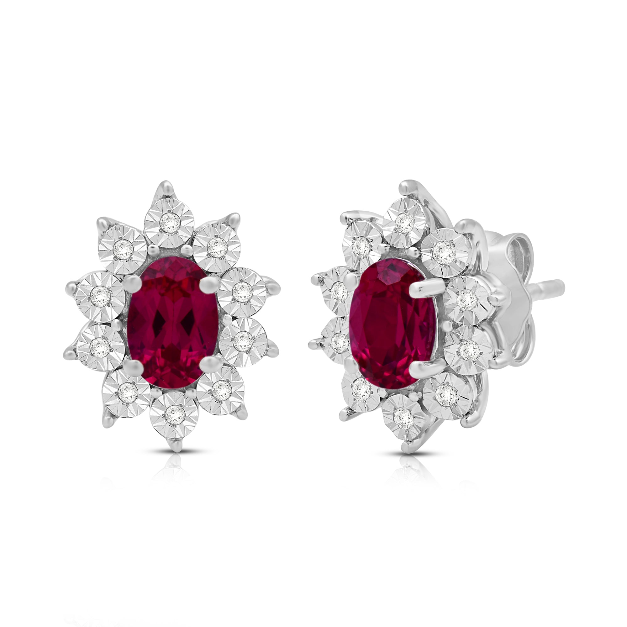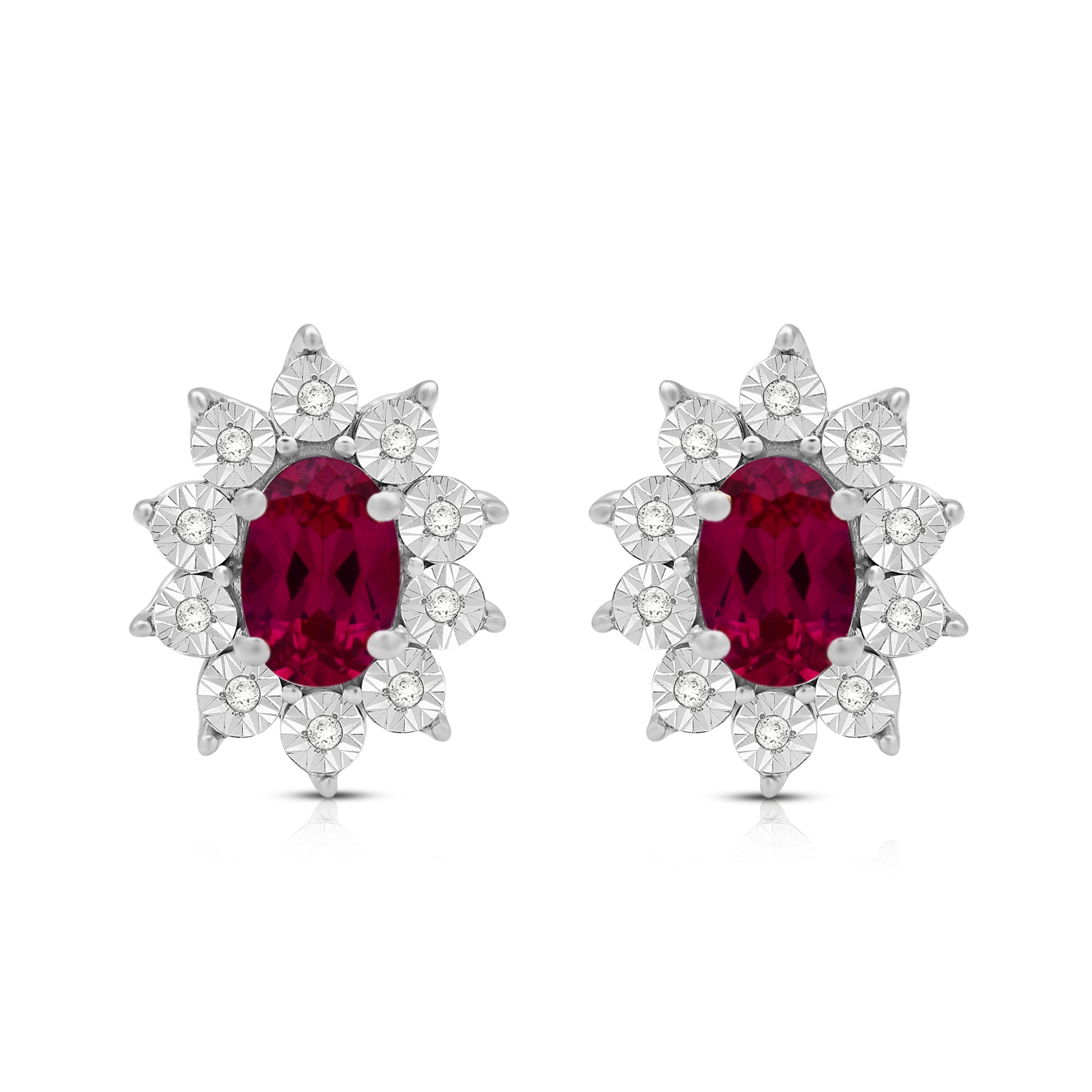 Elevate your style with our exquisite Sterling Silver cluster stud earrings. Each earring features a 6x4mm oval Created Ruby gemstone, surrounded by a delicate cluster of 1/20 carat total weight natural white round Diamonds. Sterling silver enhances the allure of these earrings, creating a luxurious and sophisticated look. These earrings are the perfect addition to any ensemble, adding a touch of elegance and brilliance to both formal occasions and everyday wear.
