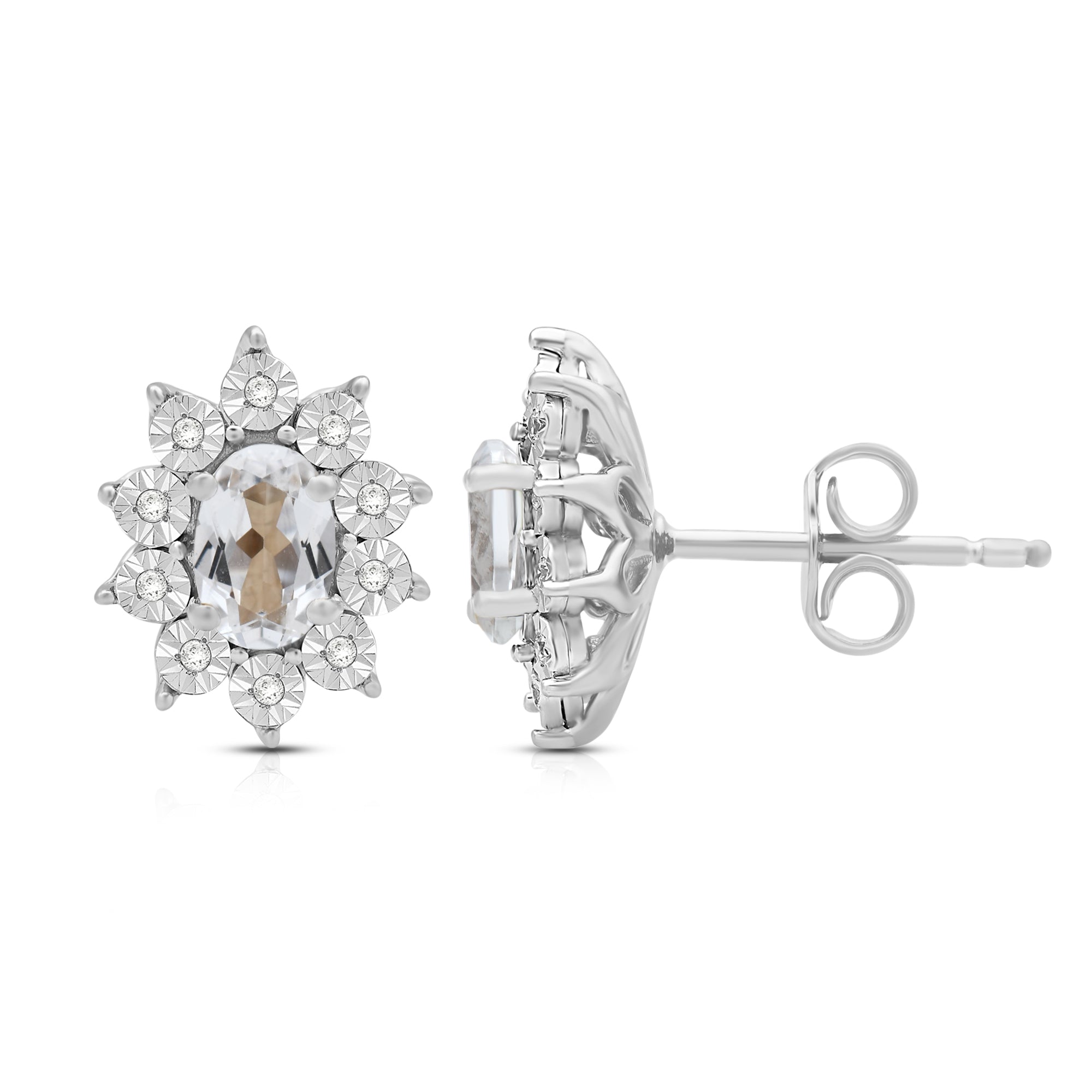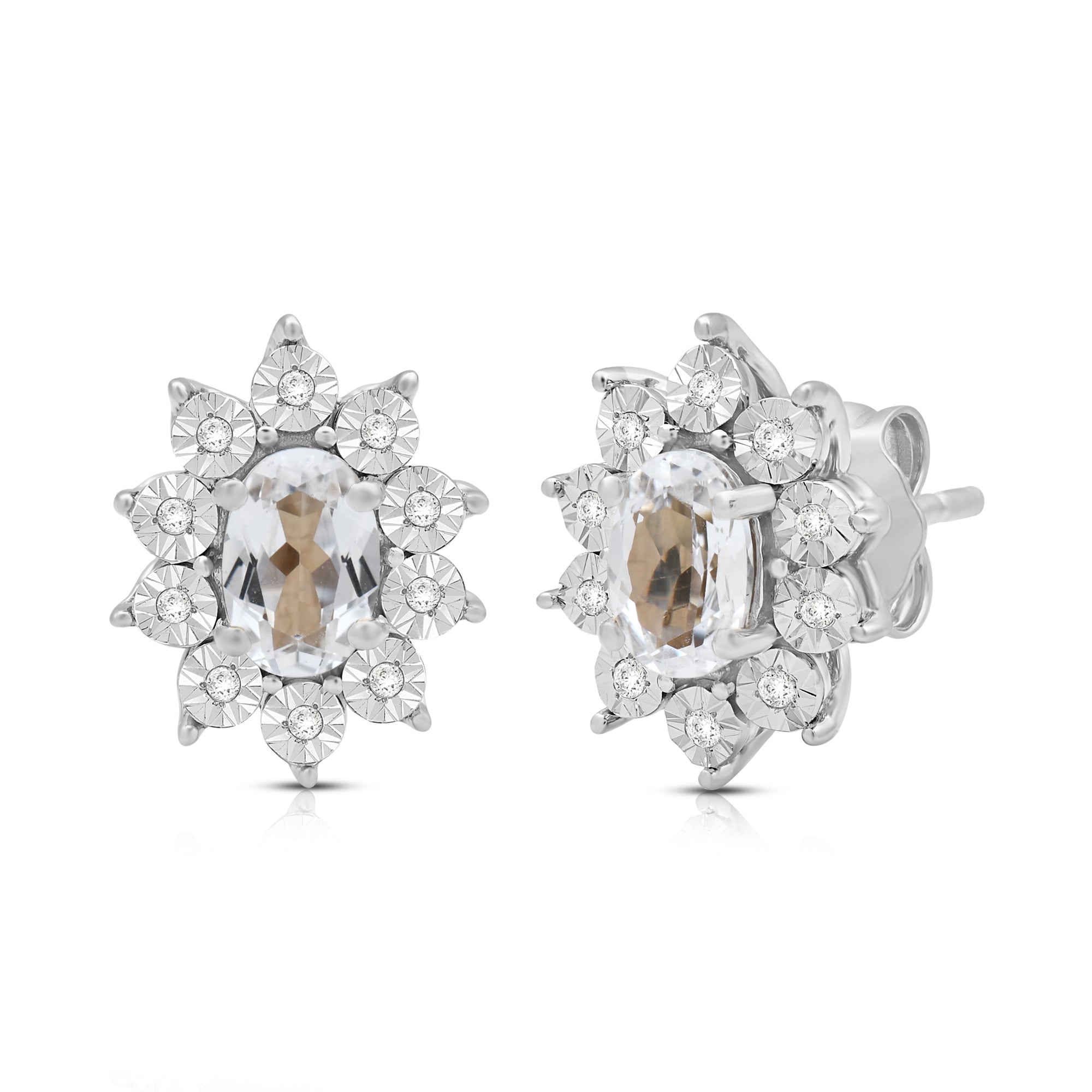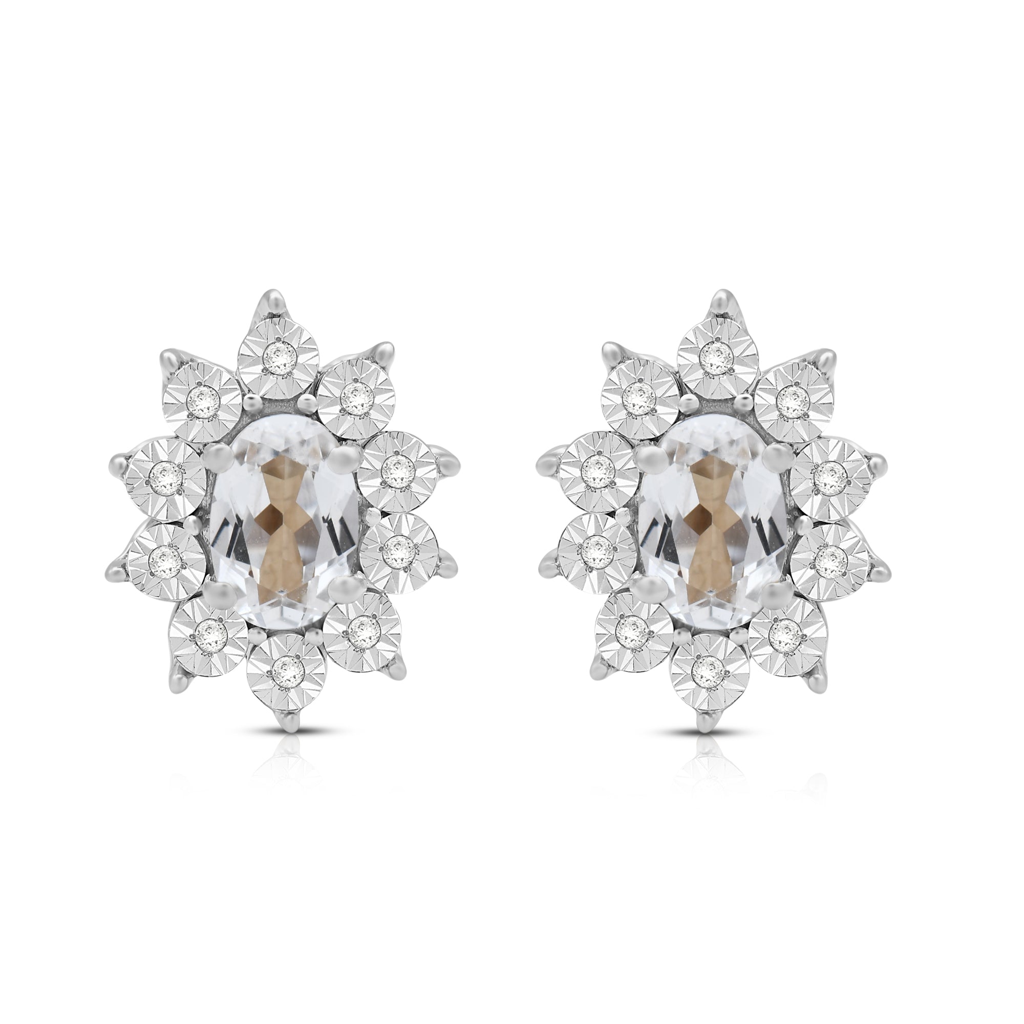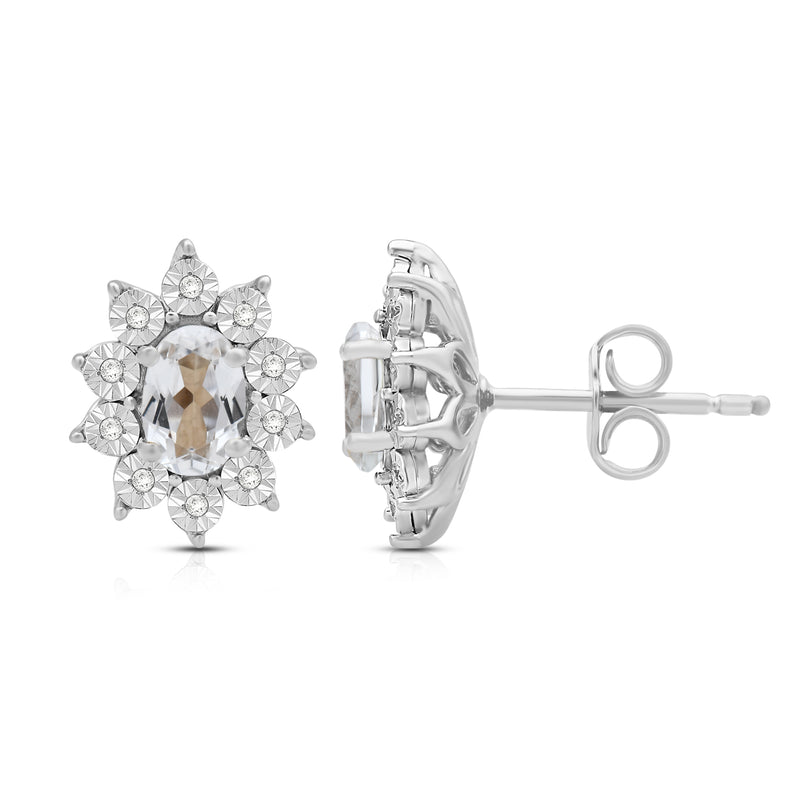 Elevate your style with our exquisite Sterling Silver cluster stud earrings. Each earring features a 6x4mm oval Created White Sapphire gemstone, surrounded by a delicate cluster of 1/20 carat total weight natural white round Diamonds. Sterling silver enhances the allure of these earrings, creating a luxurious and sophisticated look. These earrings are the perfect addition to any ensemble, adding a touch of elegance and brilliance to both formal occasions and everyday wear.