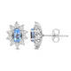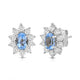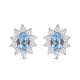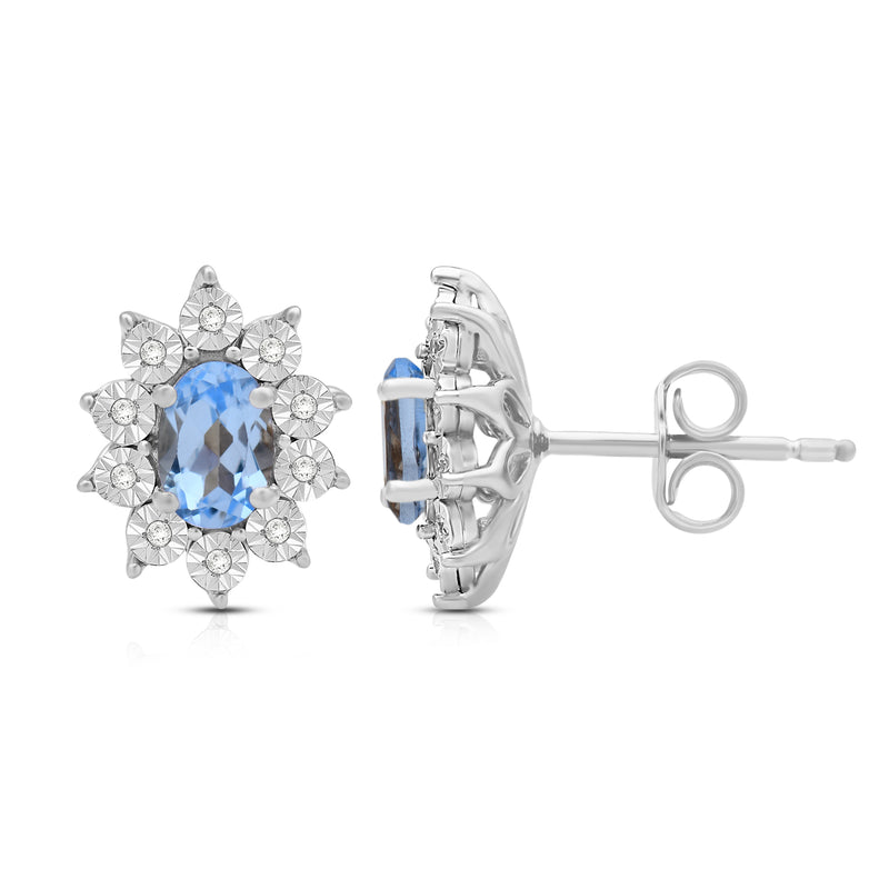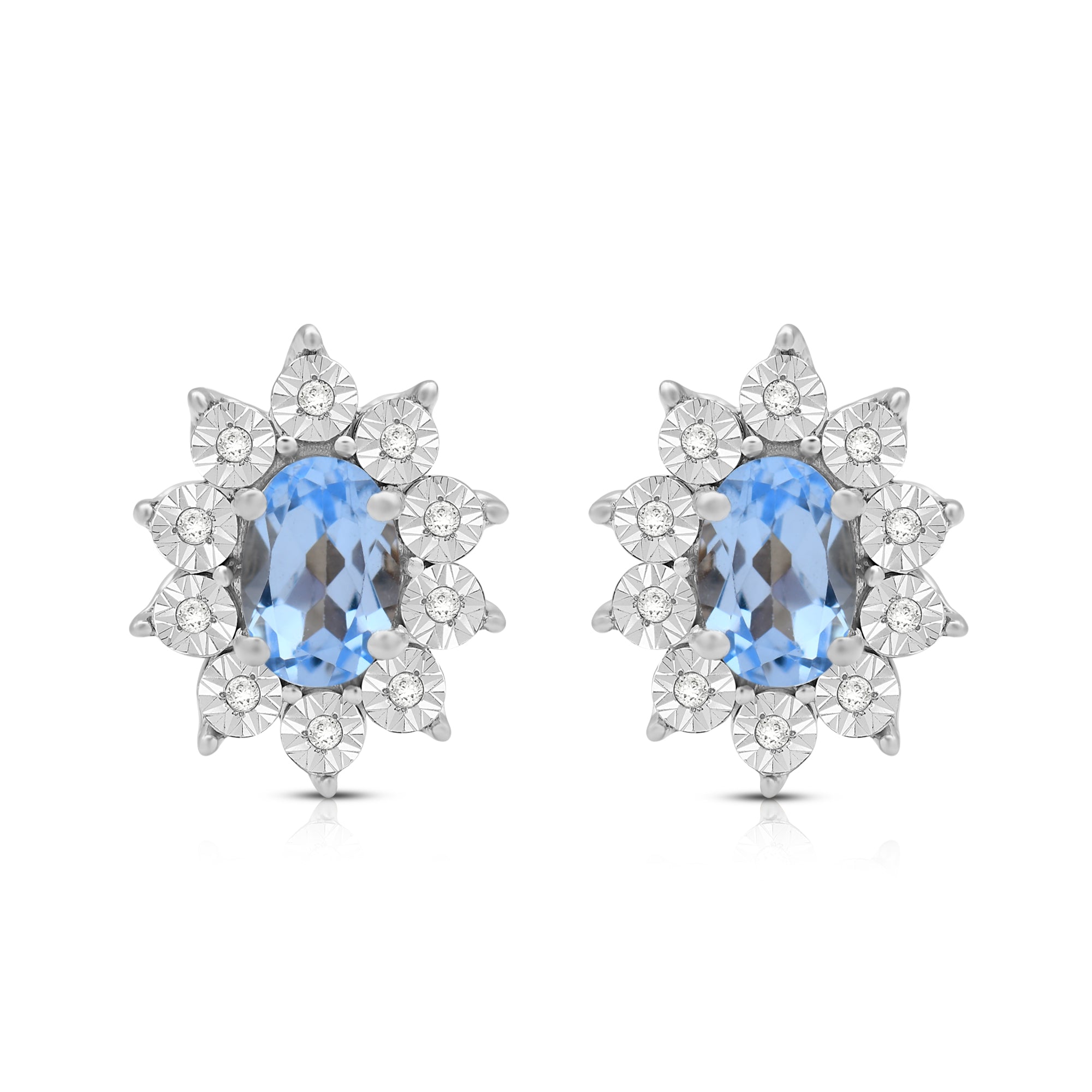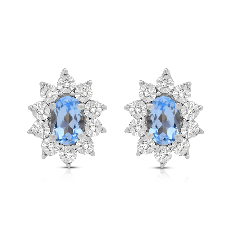 Elevate your style with our exquisite Sterling Silver cluster stud earrings. Each earring features a 6x4mm oval genuine Swiss Blue Topaz gemstone, surrounded by a delicate cluster of 1/20 carat total weight natural white round Diamonds. Sterling silver enhances the allure of these earrings, creating a luxurious and sophisticated look. These earrings are the perfect addition to any ensemble, adding a touch of elegance and brilliance to both formal occasions and everyday wear.