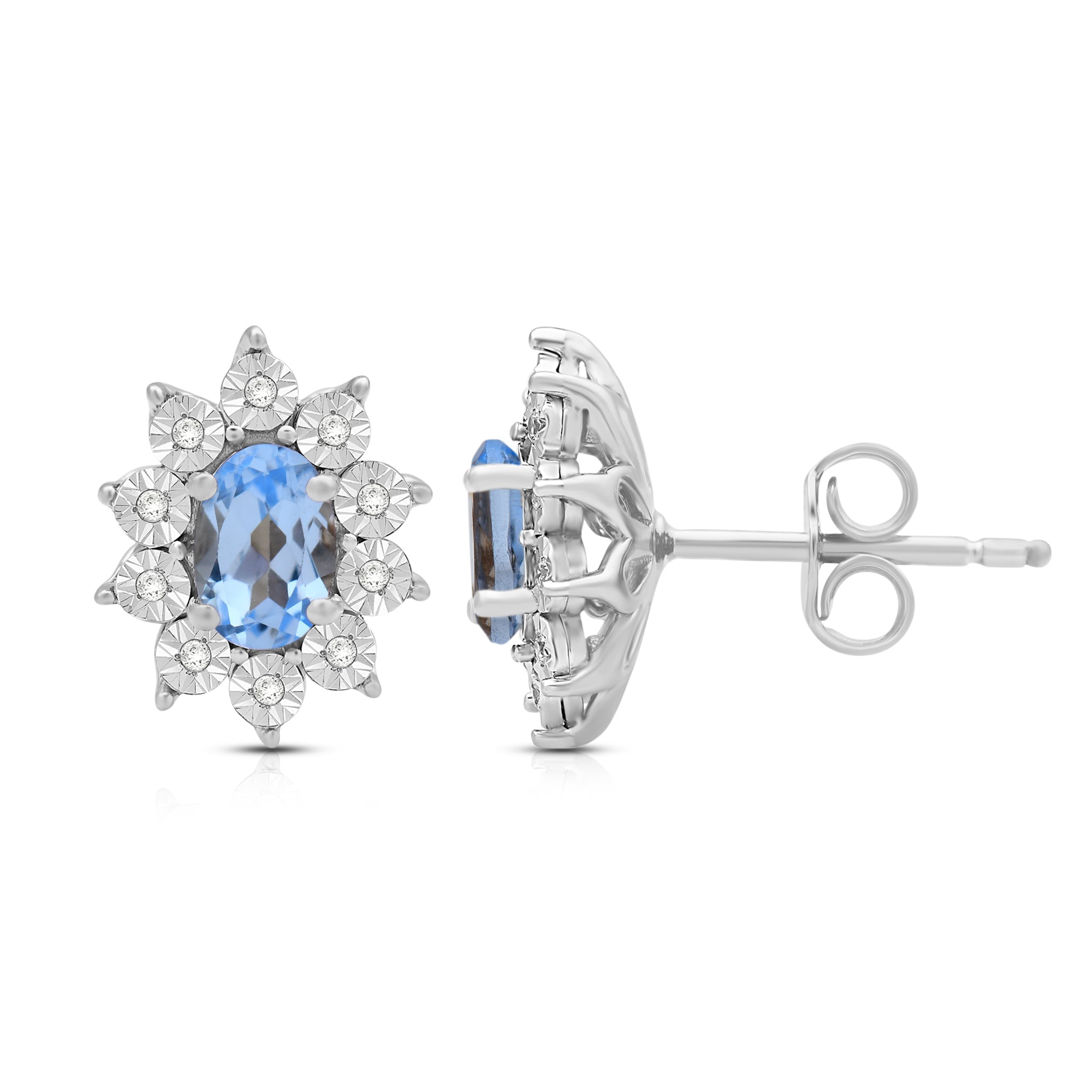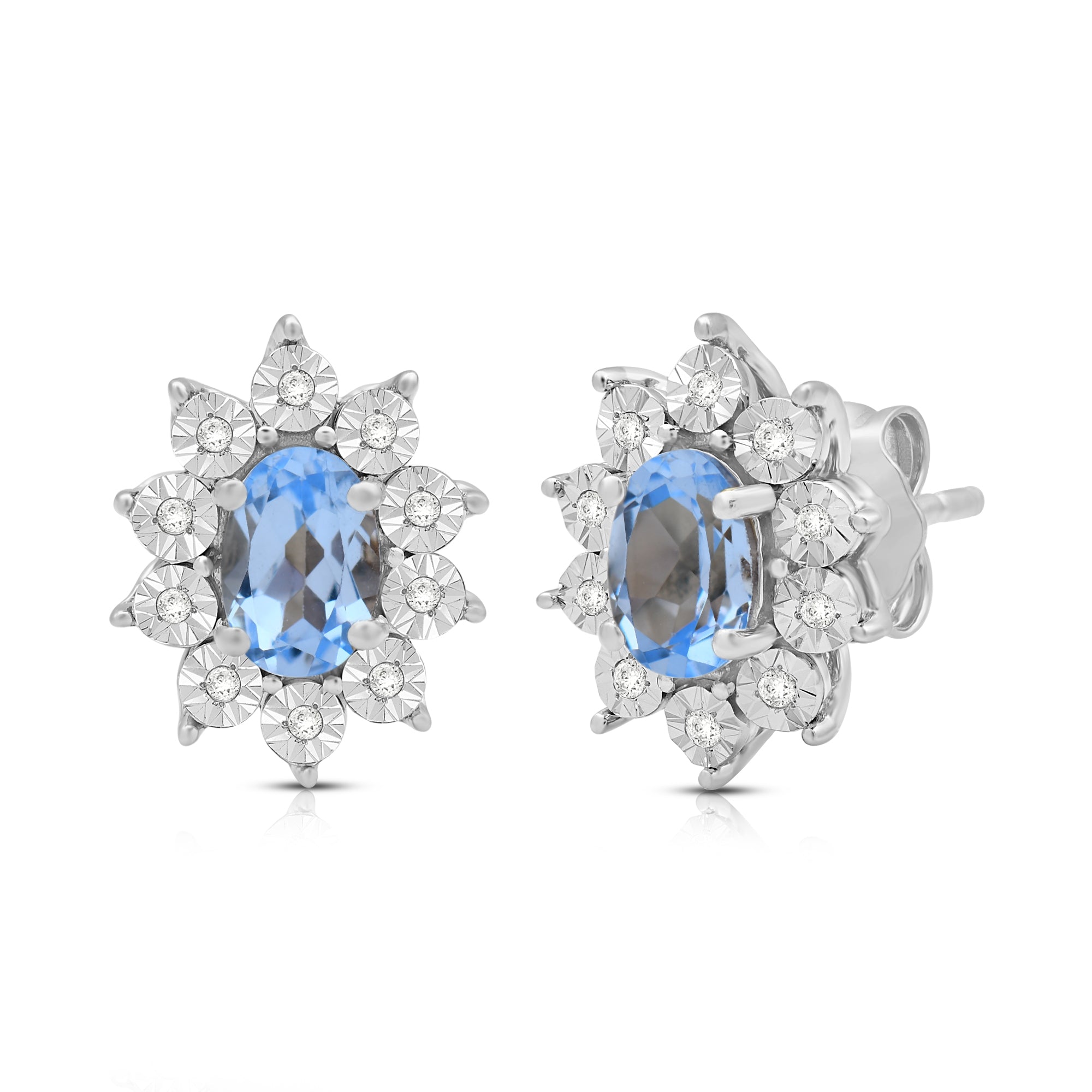 Jewelili Sterling Sliver 6x4 MM Oval Genuine Swiss Blue Topaz and 1/20 Cttw Natural White Round Diamond Cluster Stud Earrings