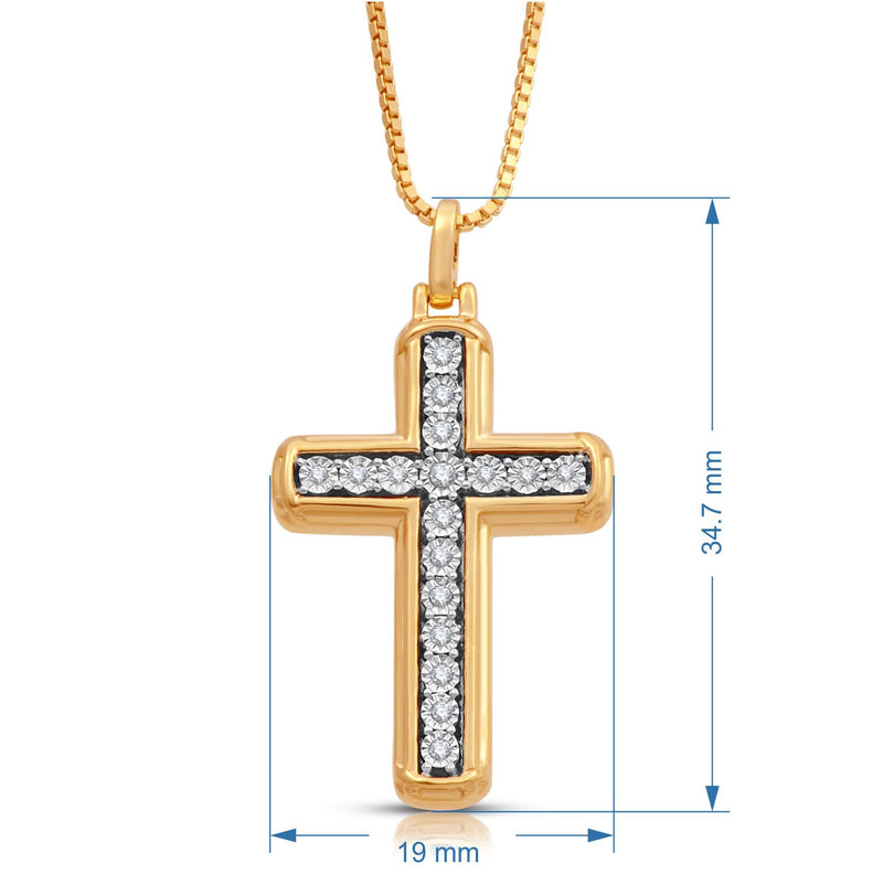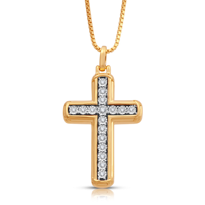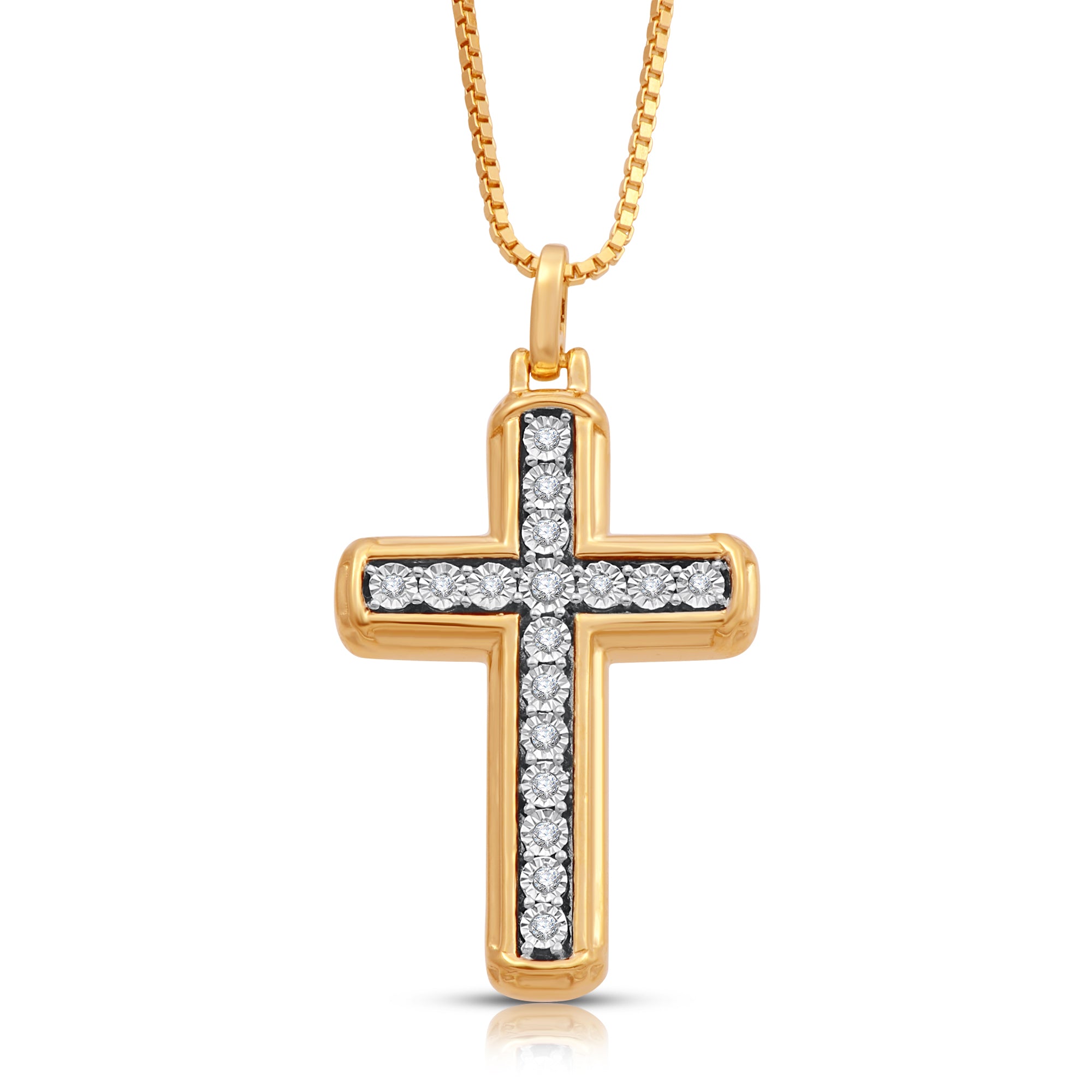Jewelili 14K Yellow Gold over Sterling Silver 1/10 CTTW Natural White Round Miracle Plated Diamonds Mens Cross Pendant Necklace
