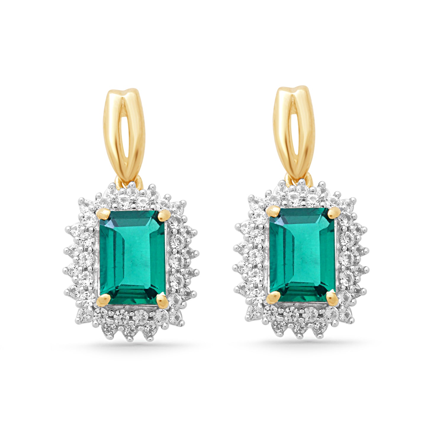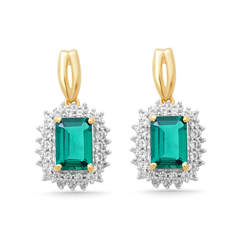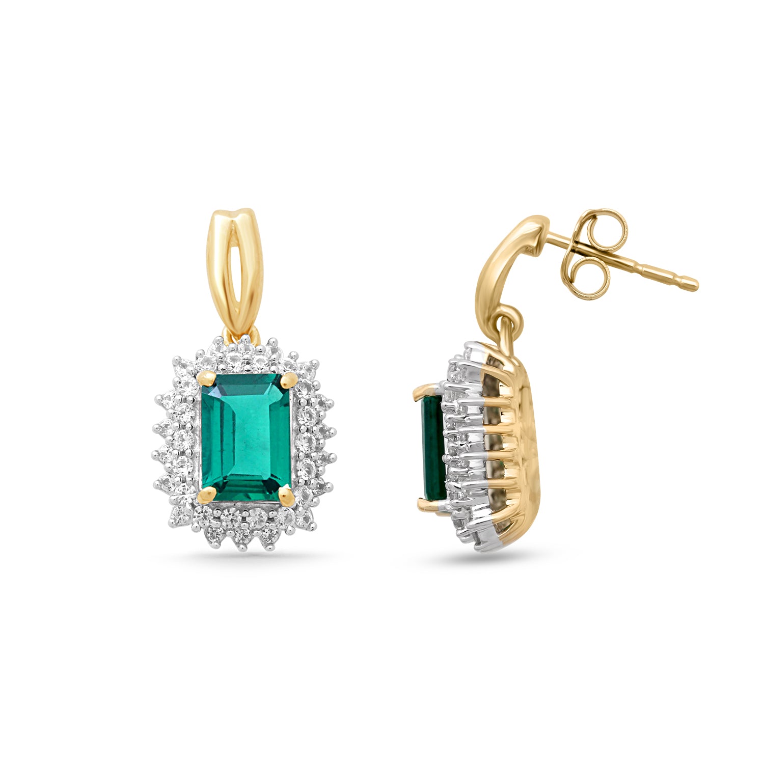 • Yellow Gold Over Sterling Silver Octagon Shape Created Emerald and Round Created White Sapphire Dangle Earrings
