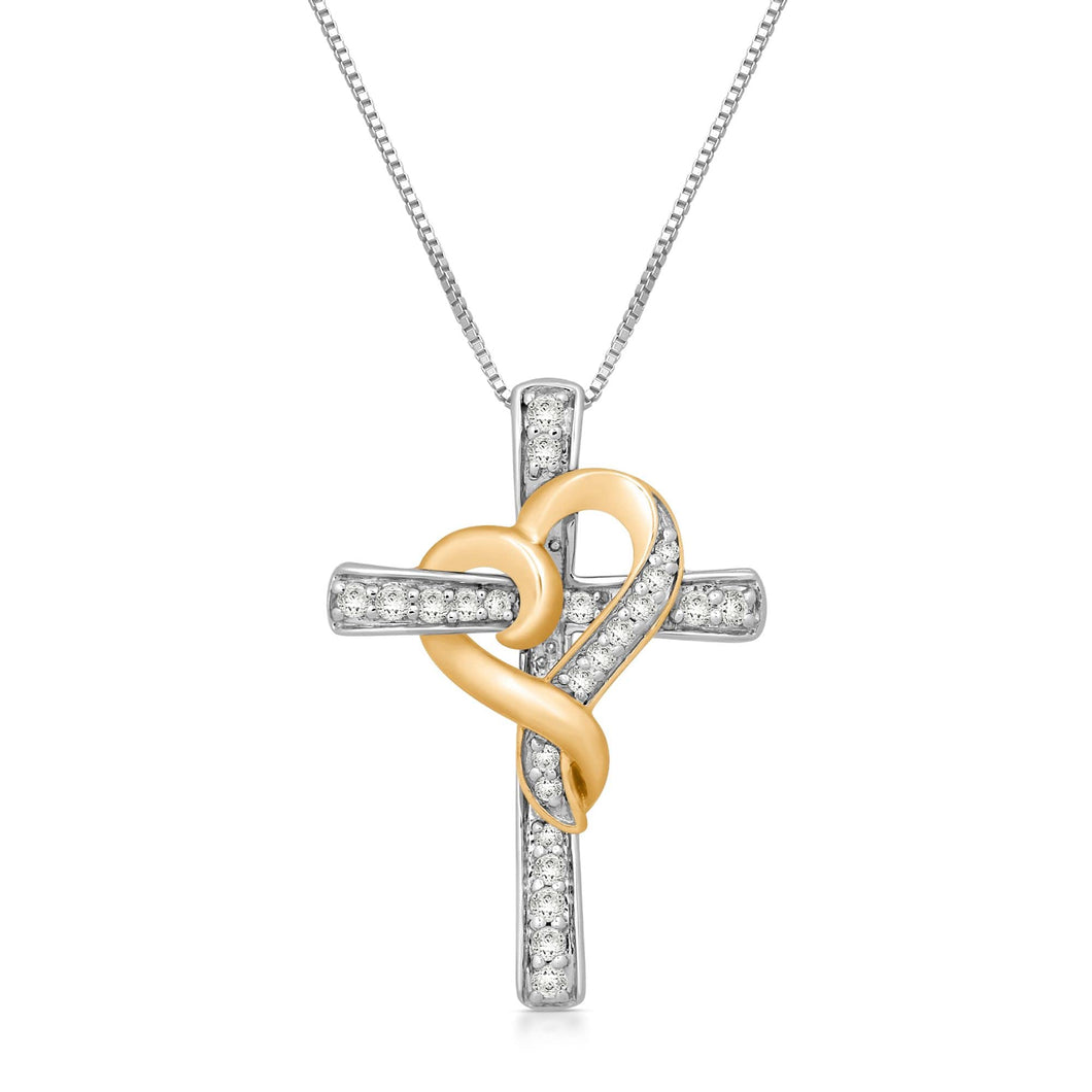 • Yellow Gold Over Sterling Silver With 1/4 Cttw Natural White Round Diamonds Heart Cross Pendant Necklace
