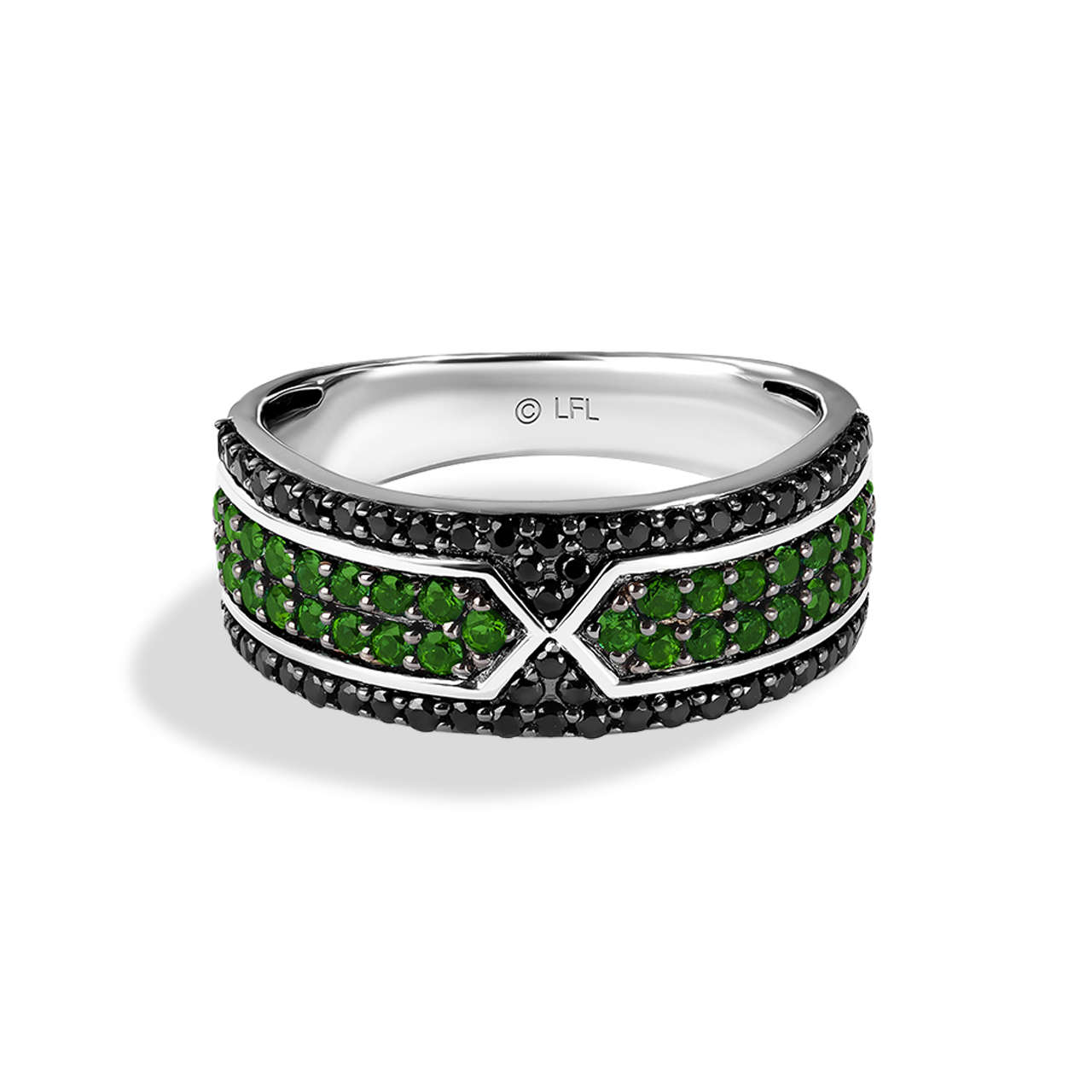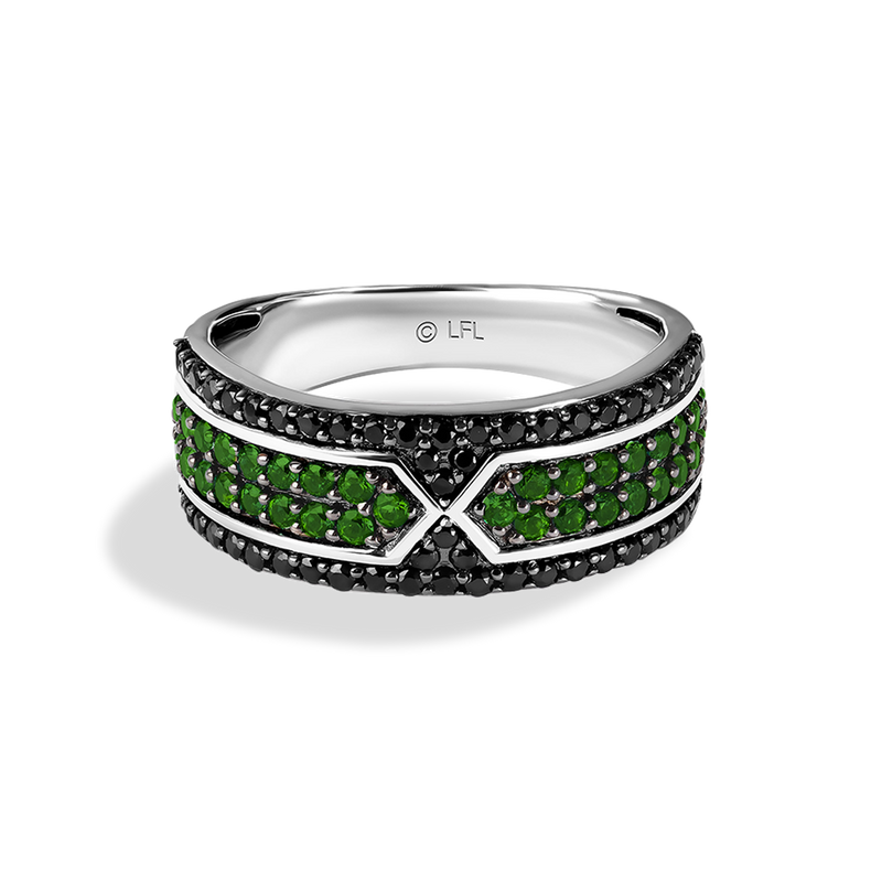 Inspired by the resiliency of Luke Skywalker™, tap into the light side with the striking Skywalker ring featuring black diamonds with green Diopside gemstones. This piece is carefully designed to help you fulfill your destiny.
