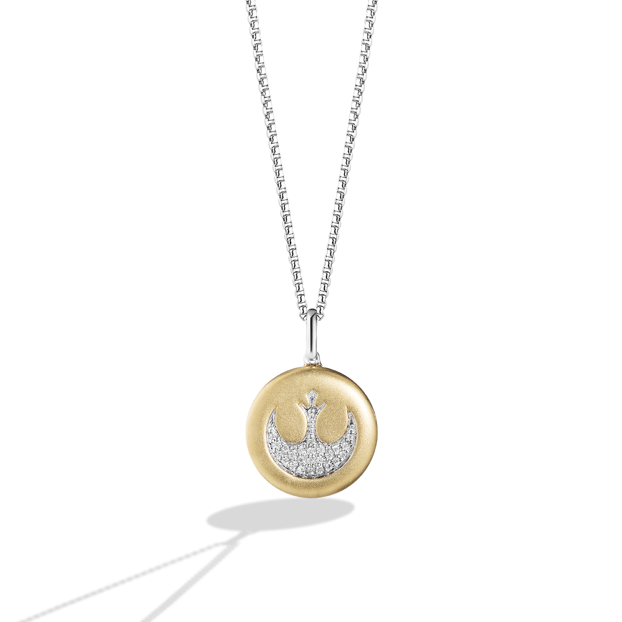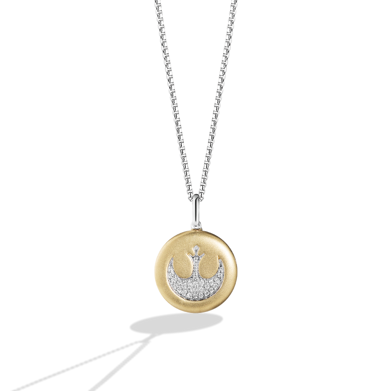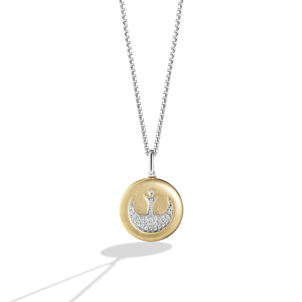 Take a stand against the Galactic Empire and join the Rebel Alliance with this sterling silver and 10k yellow gold matte finish pendant featuring a diamond Rebel symbol.