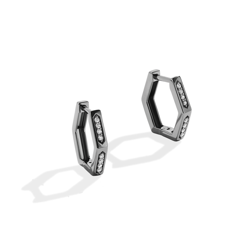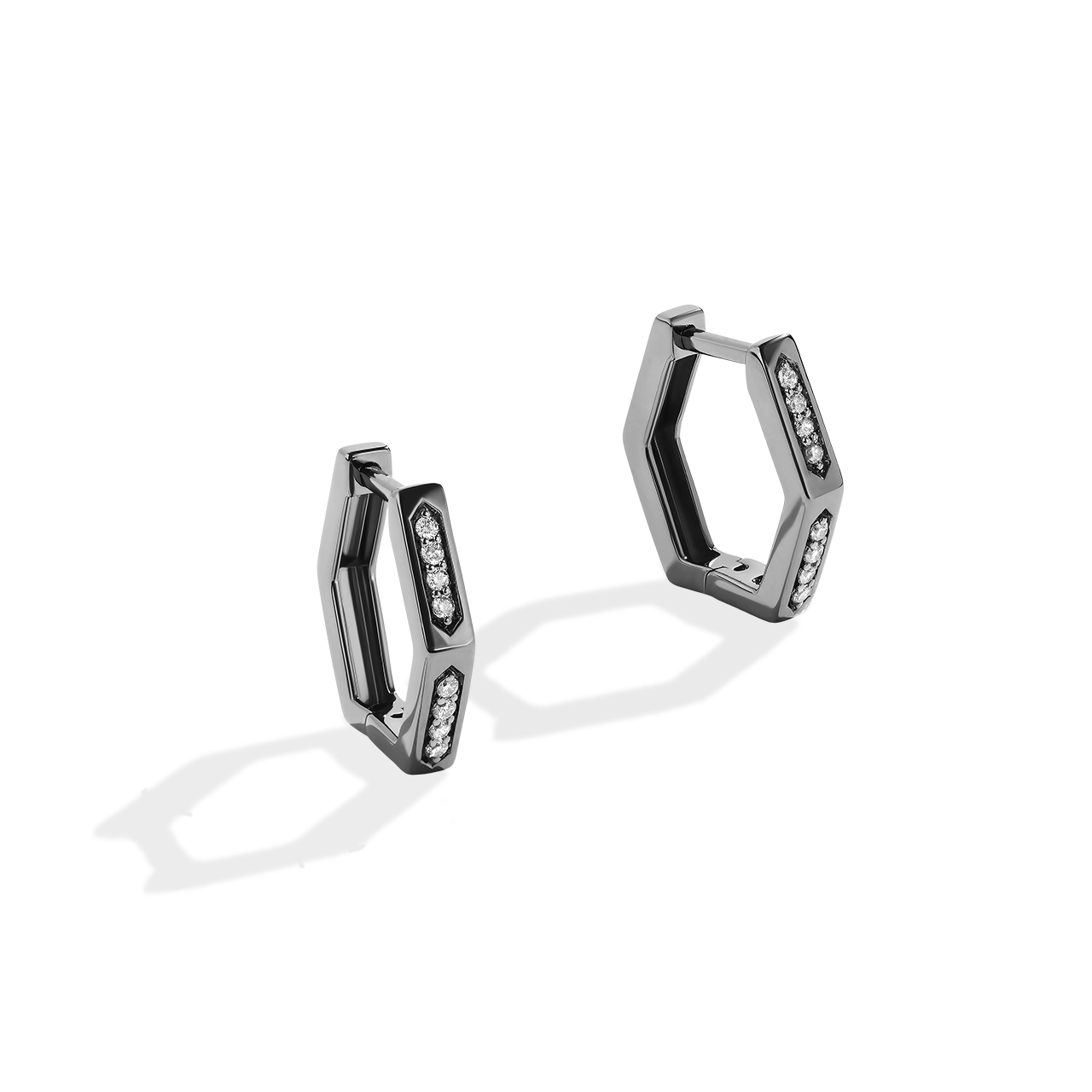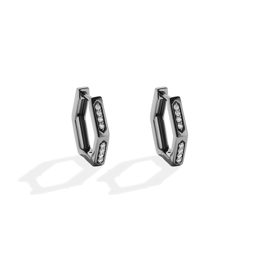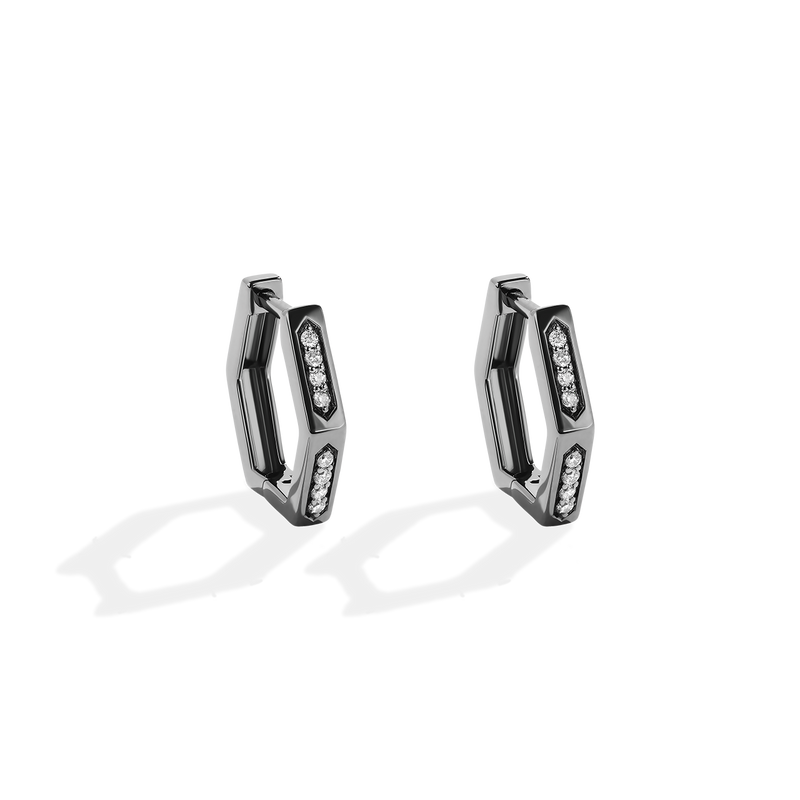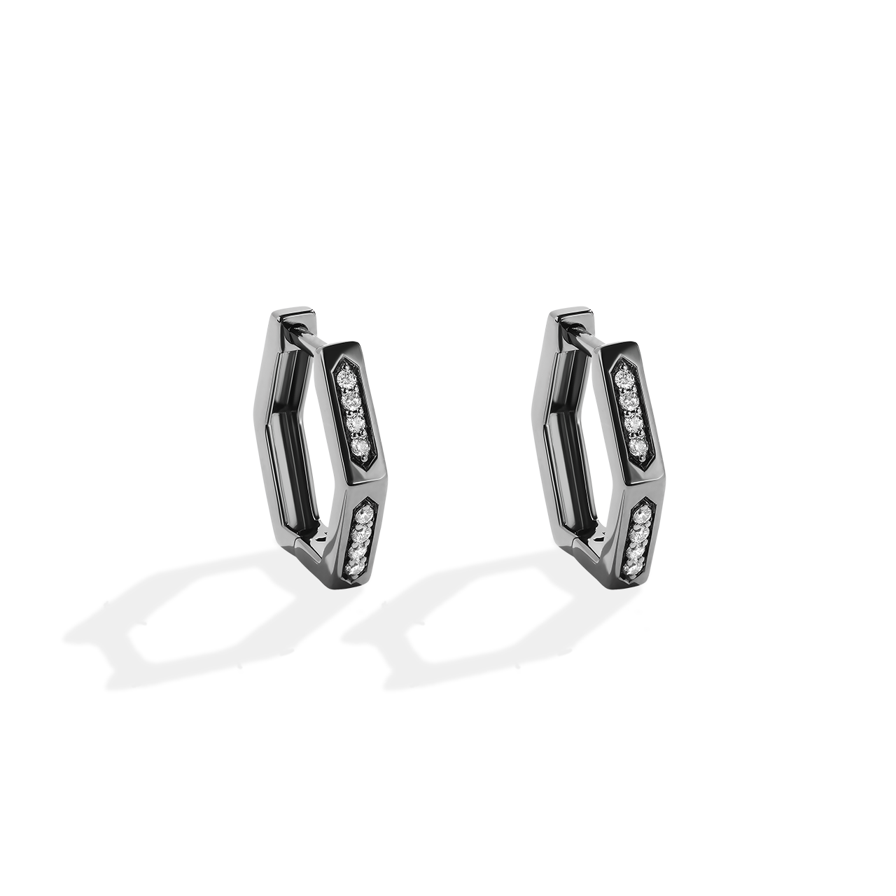 The TIE Fighter women's hoop earrings. Made in sterling silver with black rhodium and white diamonds.